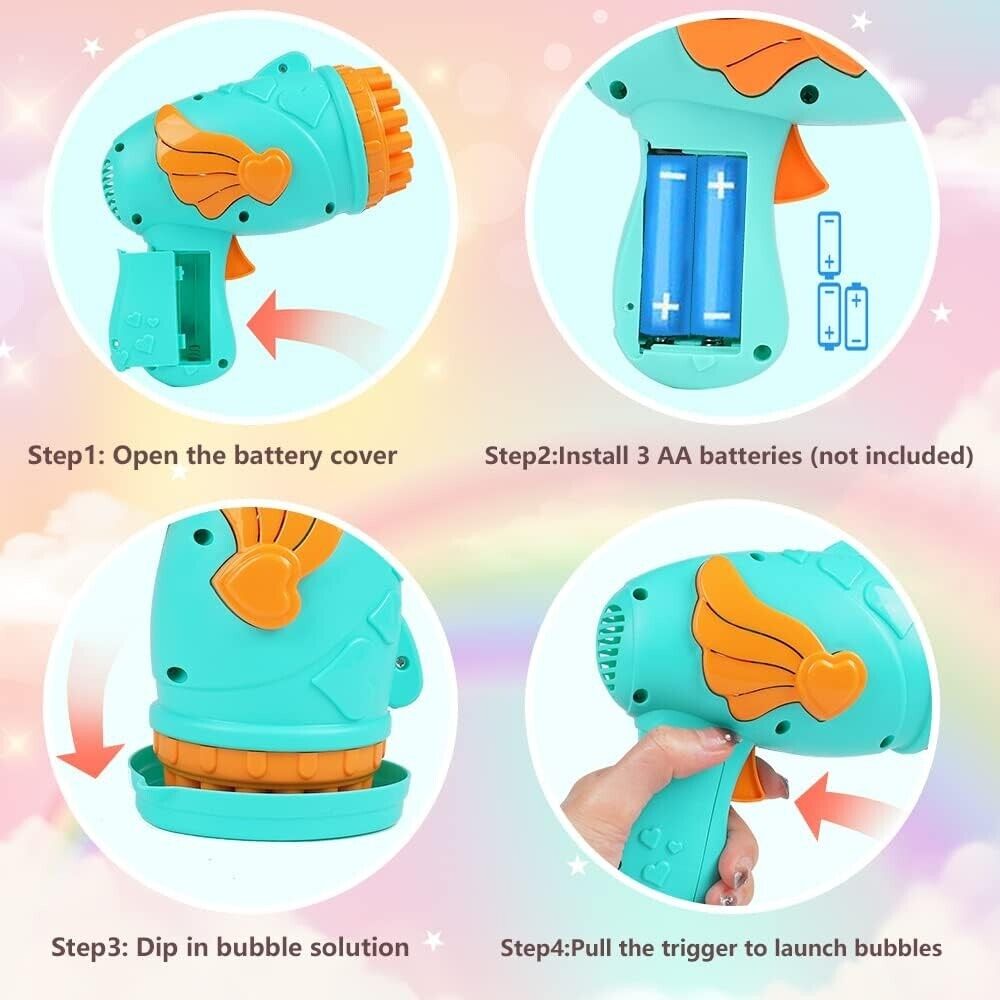 • 【Niedlich und farbenfroh Bubble Gun Design】VATOS Seifenblasenpistolen erfordern keine Montage, installieren Sie 3 AA-Batterien (nicht im Lieferumfang enthalten), tauchen Sie in Seifenblasenlösung, drücken Sie den Auslöser, tausend Seifenblasen blasen heraus, um eine Seifenblasenwelt zu machen, die Seifenblase ist nachhaltiger Gebrauch und umweltfreundlich!