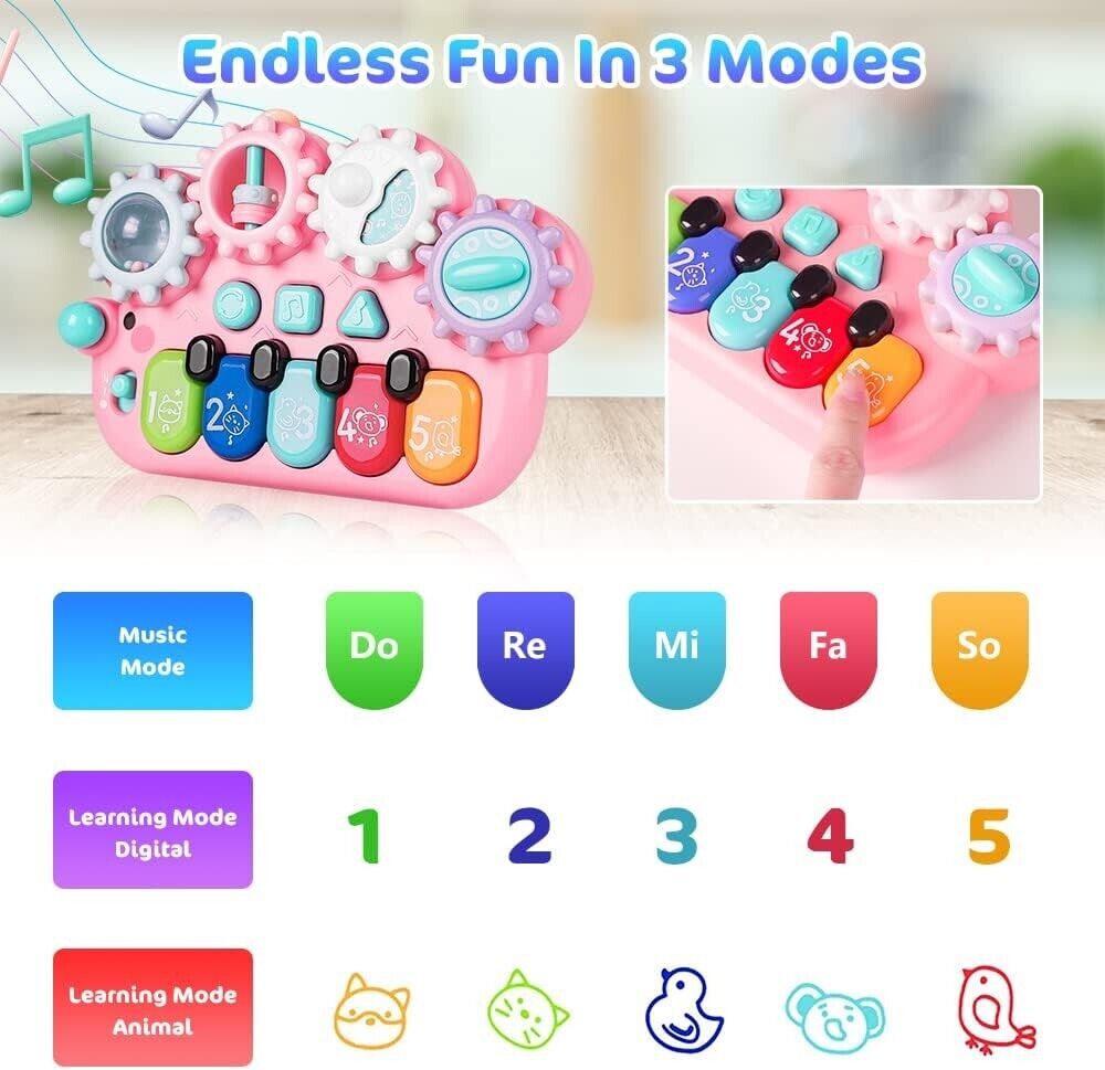 - 3-in-1 Klaviertasten - Wenn Sie die Klaviertasten mit den Babyfingern drücken, werden die entsprechenden Töne gespielt, und wenn Sie in verschiedene Modi wechseln, werden auch Tiergeräusche und verschiedene Zahlen gespielt.