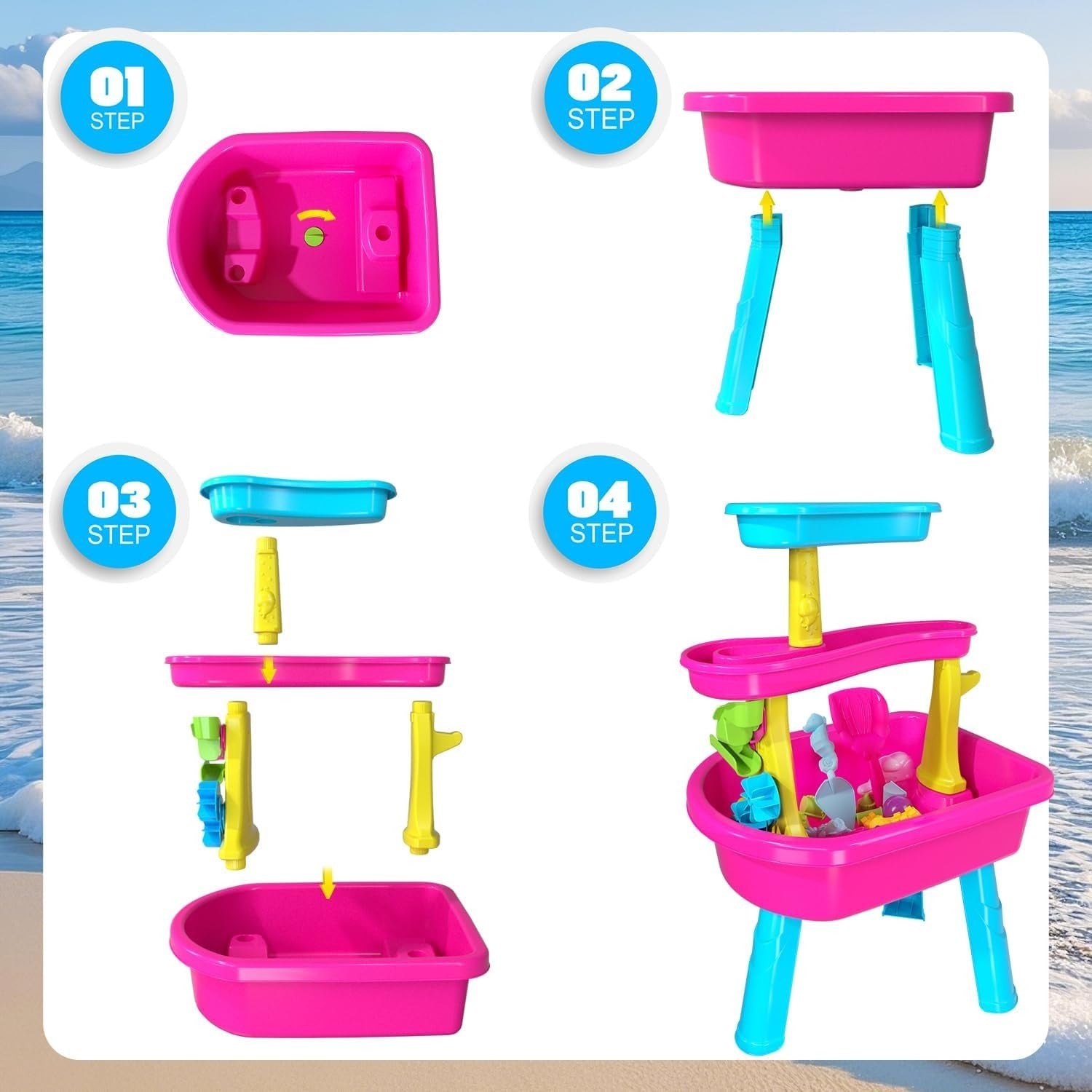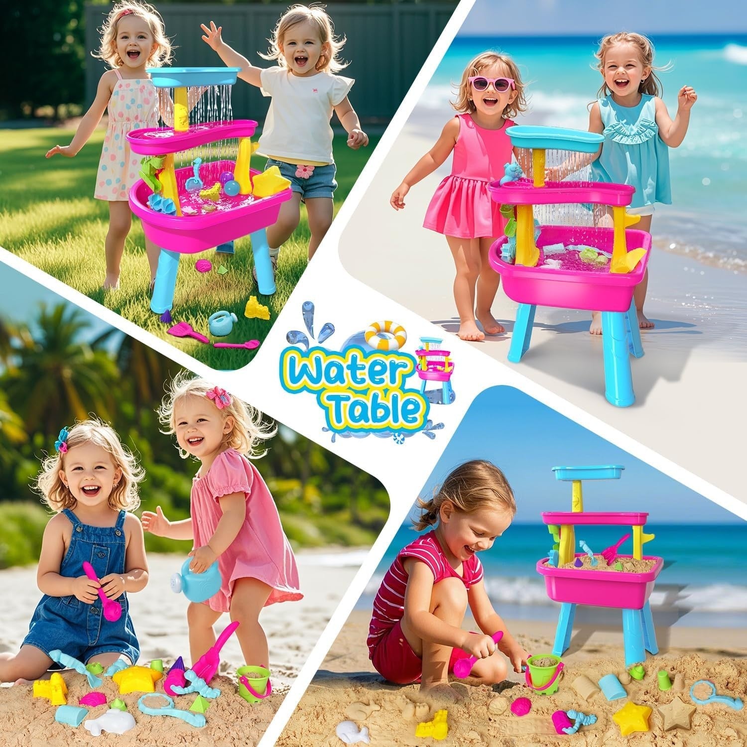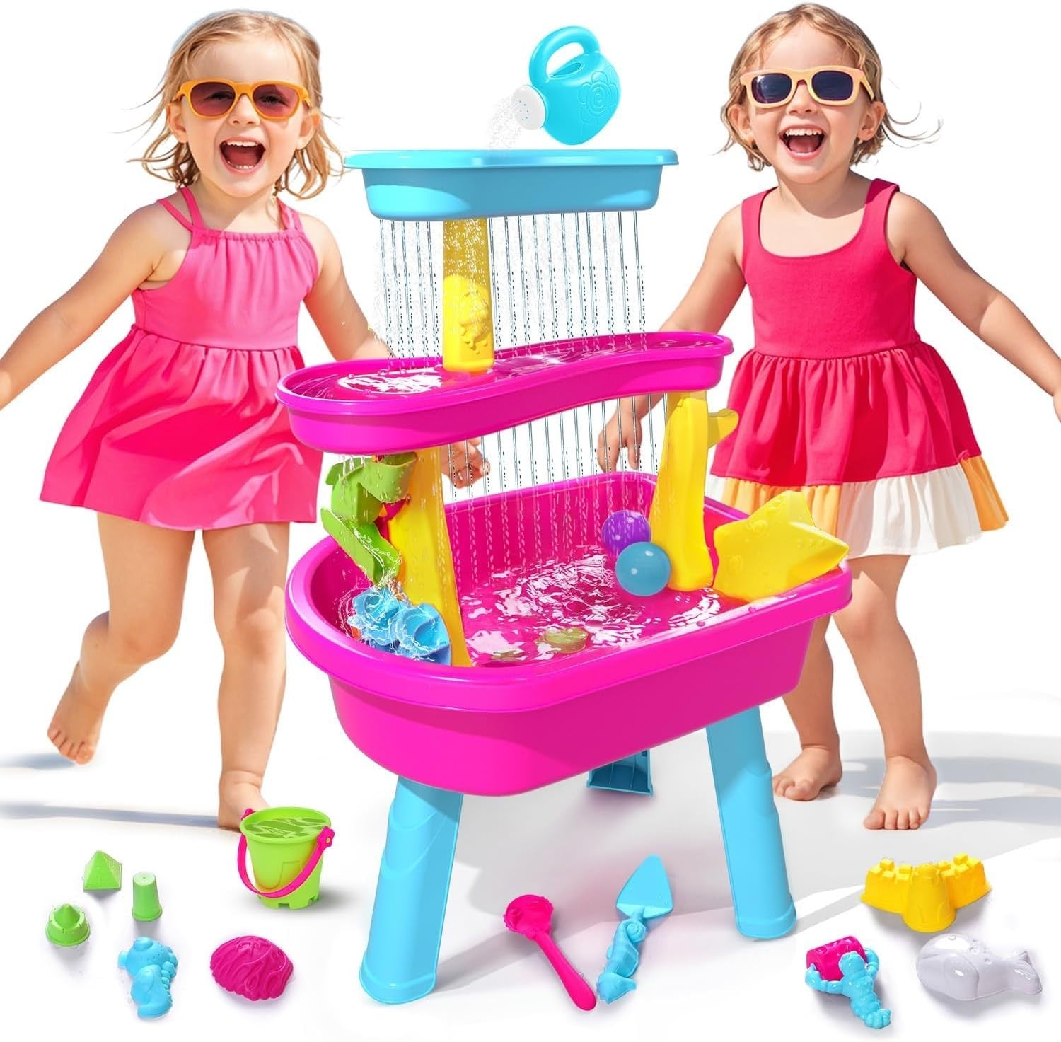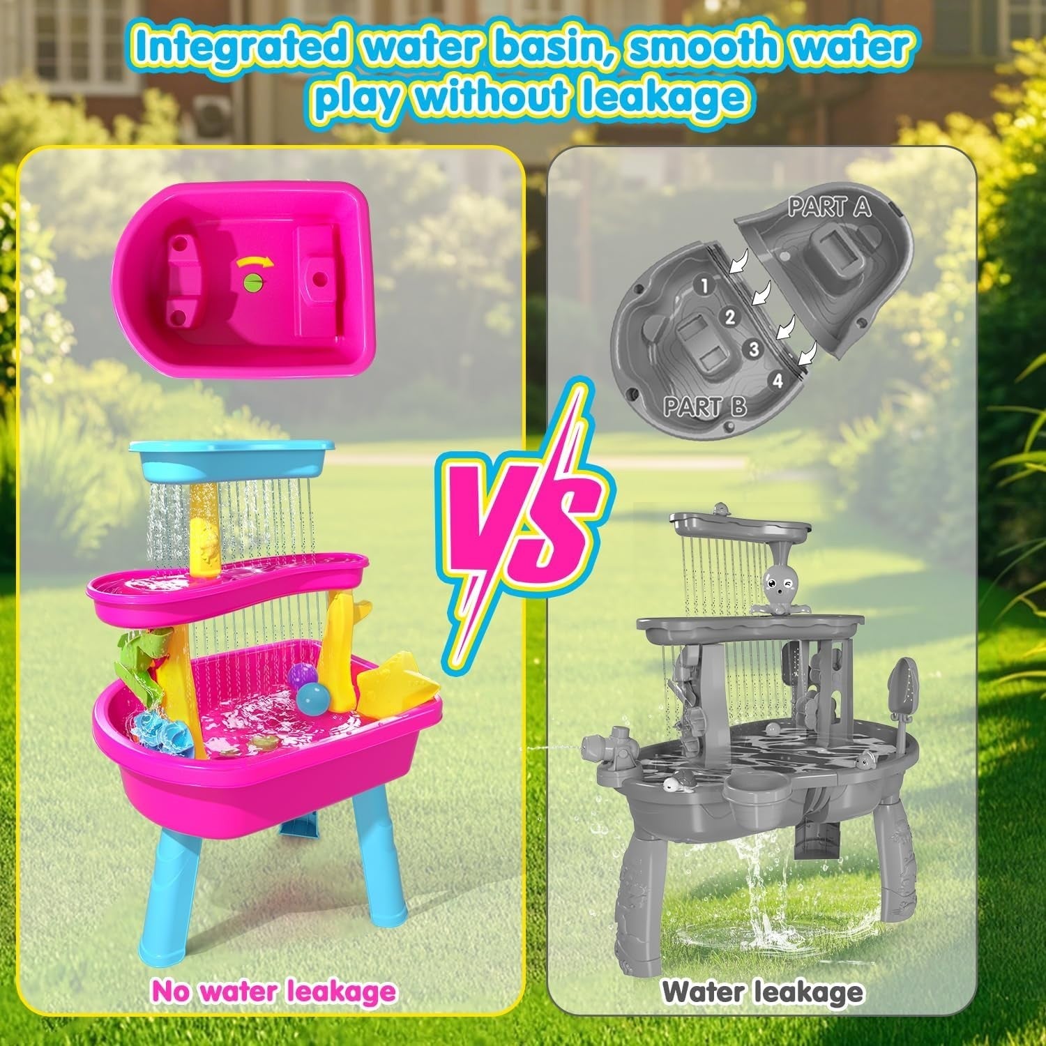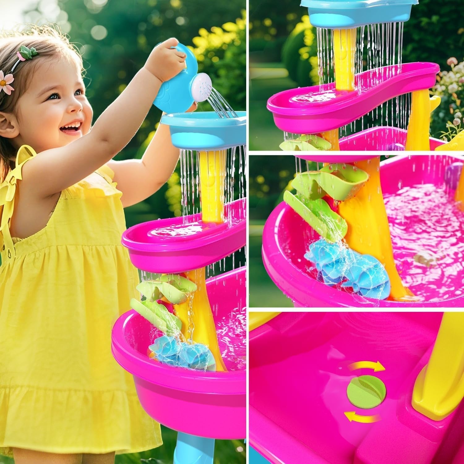 VATOS 3-Tier Wassertisch für Kinder 1-3, 37 Stück Kinder Wassertisch Regen Duschen Splash Pond Set für Outdoor-Hinterhof, Aktivität Sensory Sand Wasser Tische Sommer Spielzeug für Mädchen, Rosa