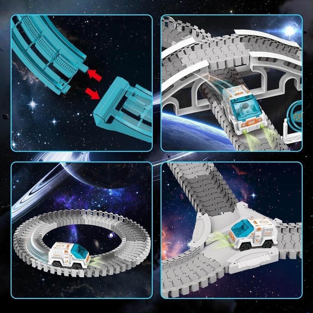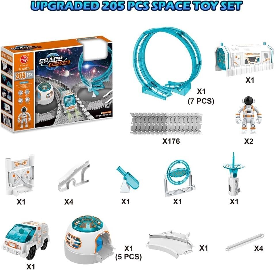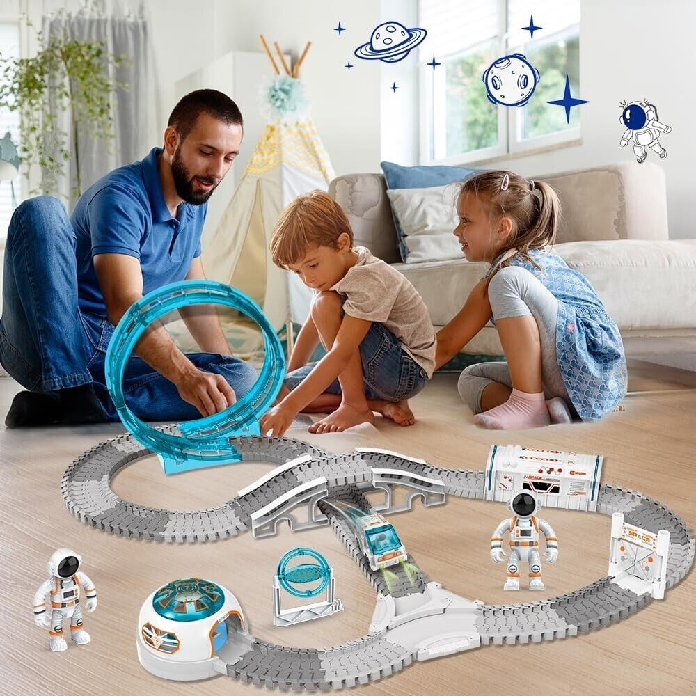 • 【Weltraum-Track-Spielzeug für Kinder】 Eine Innovation zum Weltraum-Thema und zur Rennstrecke dieses Weltraumspielzeugs. Wenn Ihr Kind Autos und Platz mag, ist das eine Win-Win-Situation. Dieses Eisenbahnspielzeug regt die Fantasie Ihres Kindes an. Das Raumzug-Set enthält 205 Schienenteile, 1 Raumfahrzeug, 1 Y-Kreuzung, 1 360°-Kreisorbit, 2 Astronautenpuppen und 1 Sternprojektor.