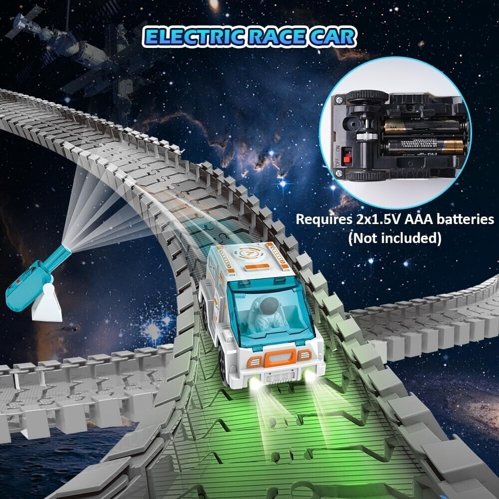 • 【Sichere, langlebige Materialien】 Die Weltraumbahn besteht aus umweltfreundlichem, hochwertigem Kunststoff, der dem ASTM-Sicherheitsstandard entspricht, und ist daher ziemlich langlebig. Der mitgelieferte Rennwagen leuchtet auf und alle Kinder lieben ihn! Das Raumfahrzeug benötigt eine 2 x 1,5-V-AAA-Batterie (nicht im Lieferumfang enthalten) und kann 2–3 Stunden lang betrieben werden.