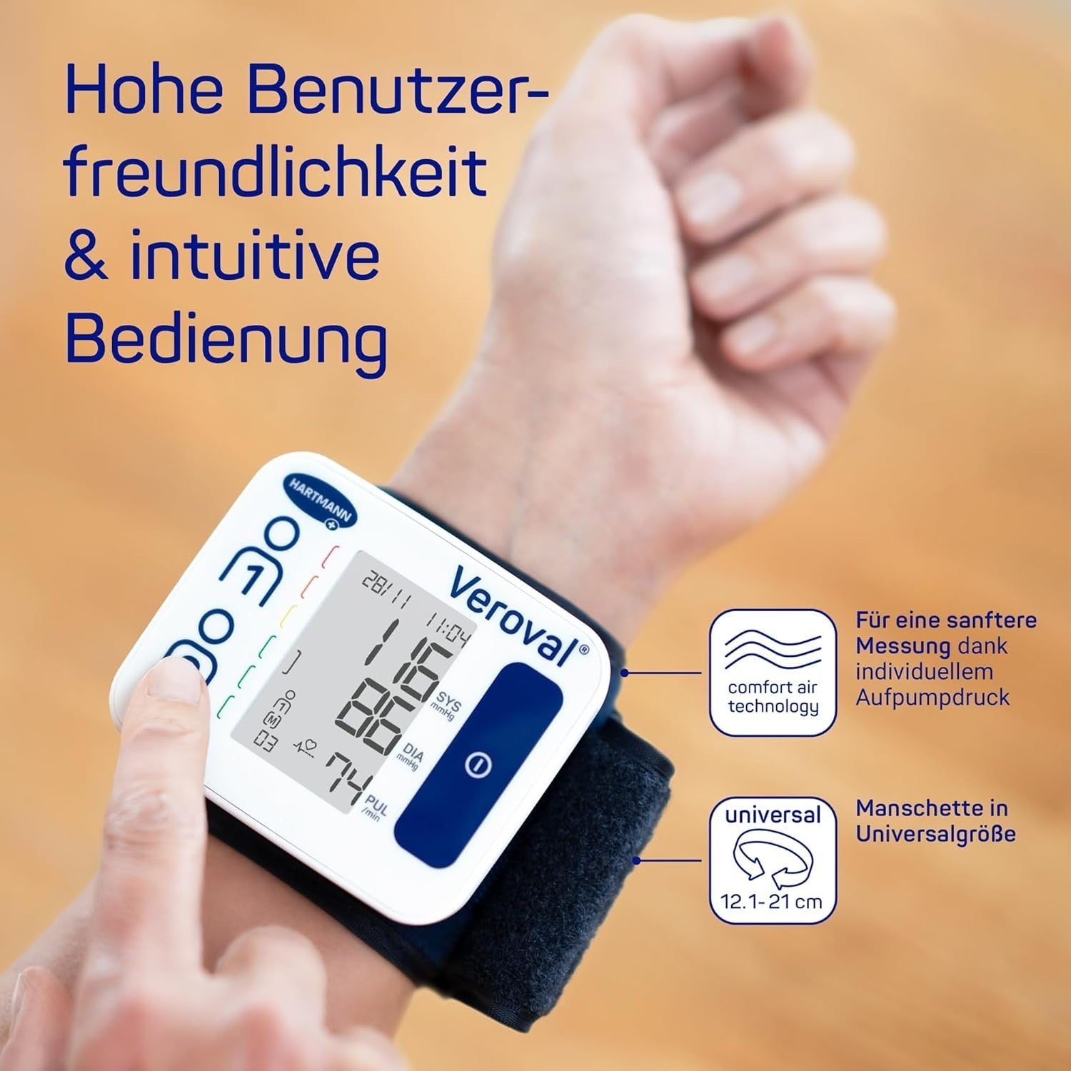 • Für die einfache und schnelle Blutdruckmessung am Handgelenk mit Arrhythmie-Erkennung