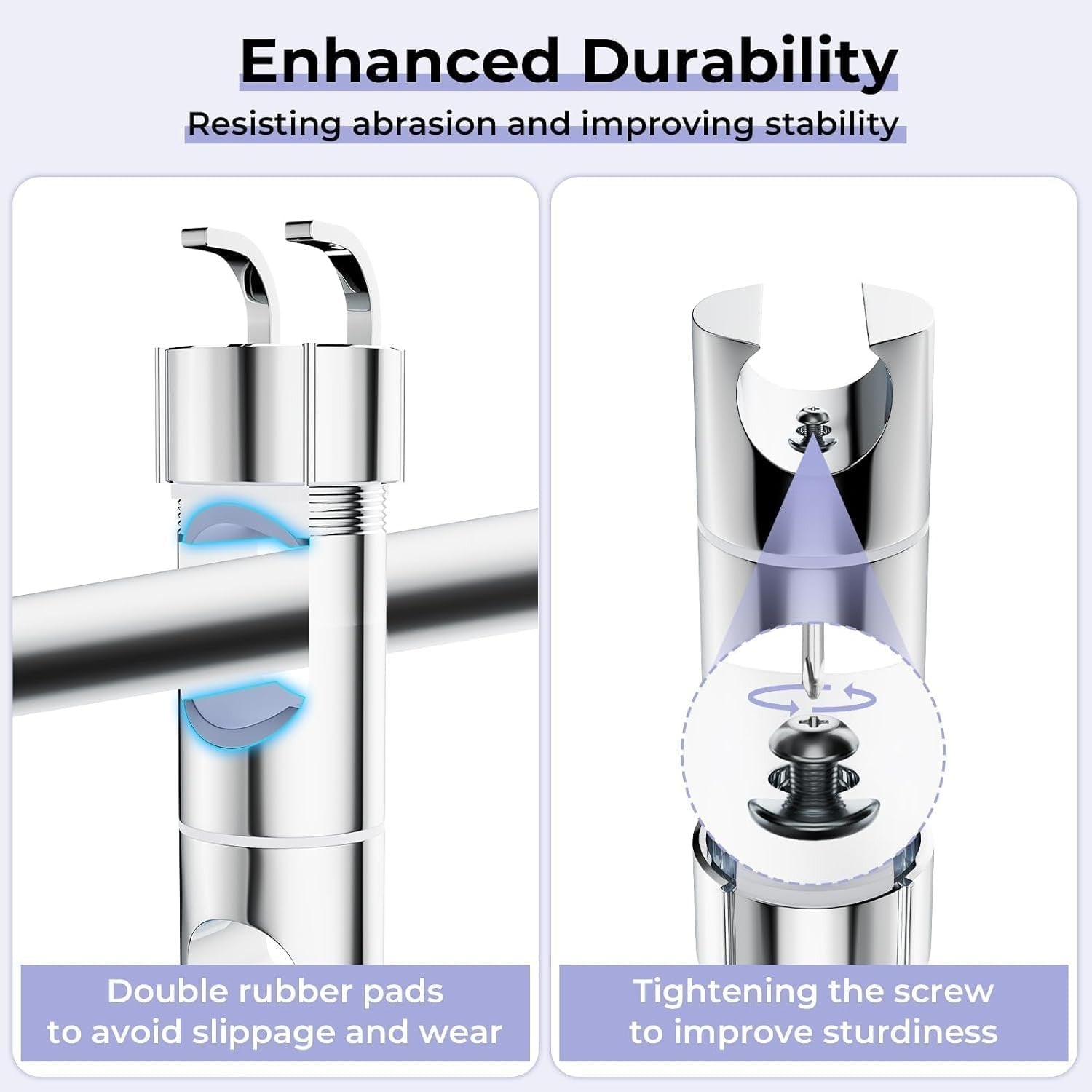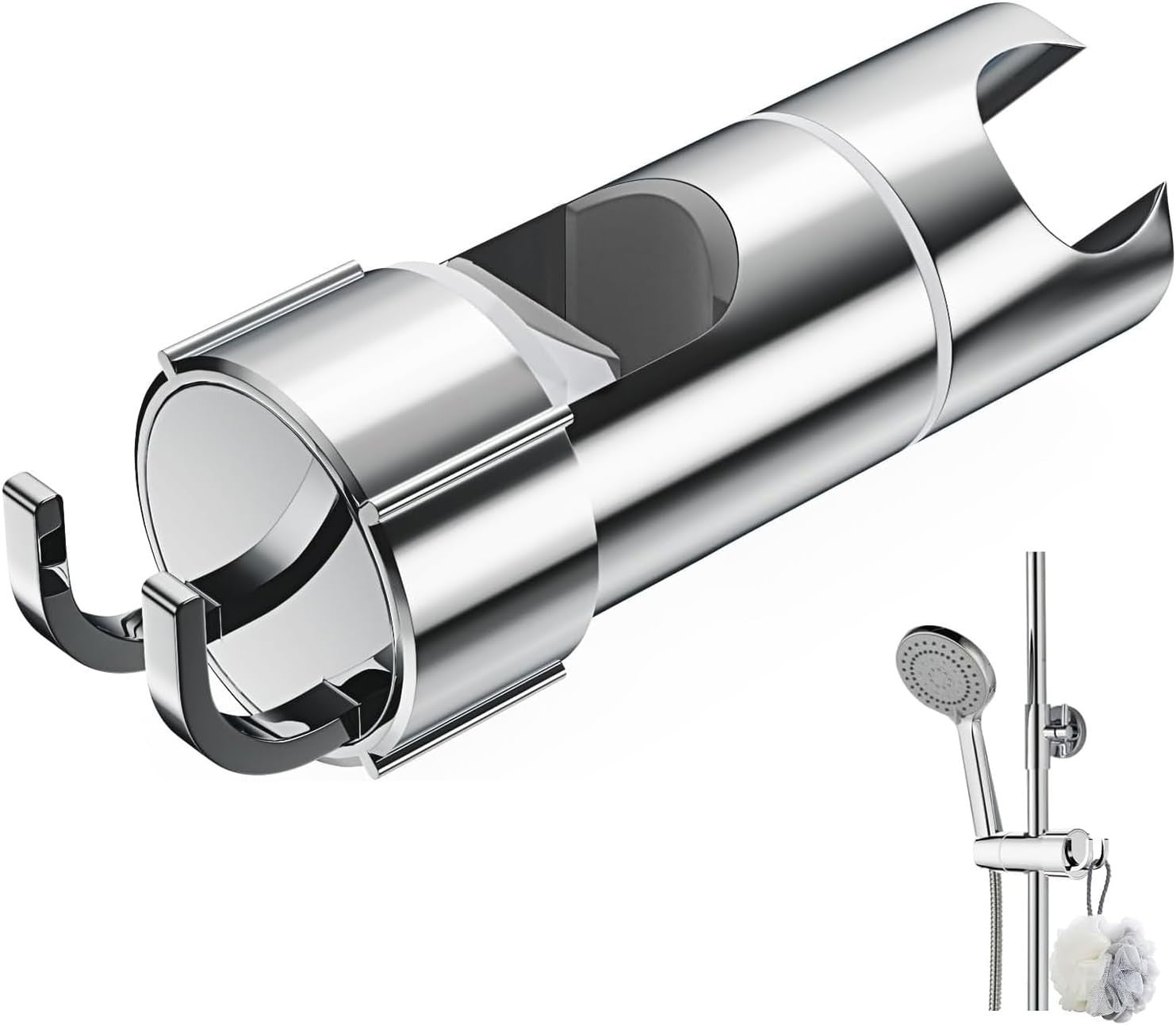 Alyvisun Verstellbarer Handbrause Halterung mit 2 Haken, Universal Duschkopfhalterung Ohne Bohren für 16-27 mm, Verchromt Brausehalter für Duschstange, 360° Drehbar, Einfache Installation