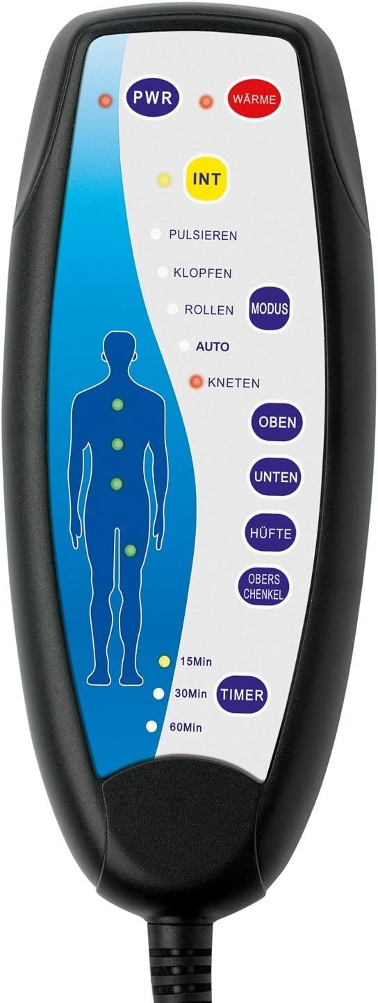 Mit 5 Massageprogrammen: Pulsieren, Rollen, Klopfen, Kneten und Automatik. Mit Timer für 3 verschiedene einstellbare Zeiten: 15 Minuten, 30 Minuten und 60 Minuten.