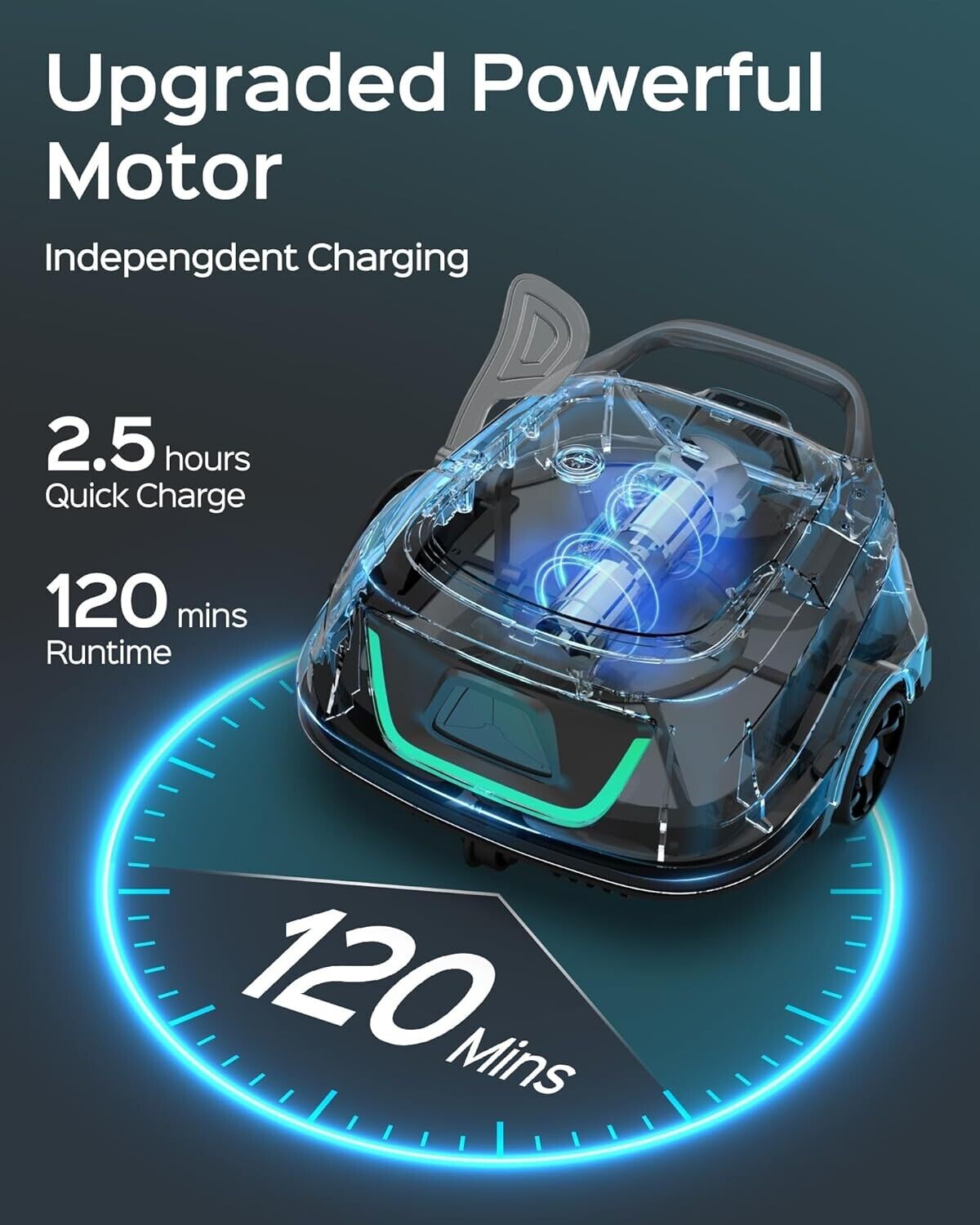 • Langlebige Akkuleistung: Der kabellose Poolsauger A1 kann mit einer einzigen Ladung bis zu 120 Minuten laufen und benötigt nur 2,5 Stunden zum vollständigen Aufladen. Es ist ideal für die Reinigung von ein- oder oberirdischen Schwimmbecken von 80 bis 100 Quadratmetern, auf unterschiedlichen Oberflächen (PVC, Vinyl oder Beton) und Formen (rund, rechteckig oder oval).