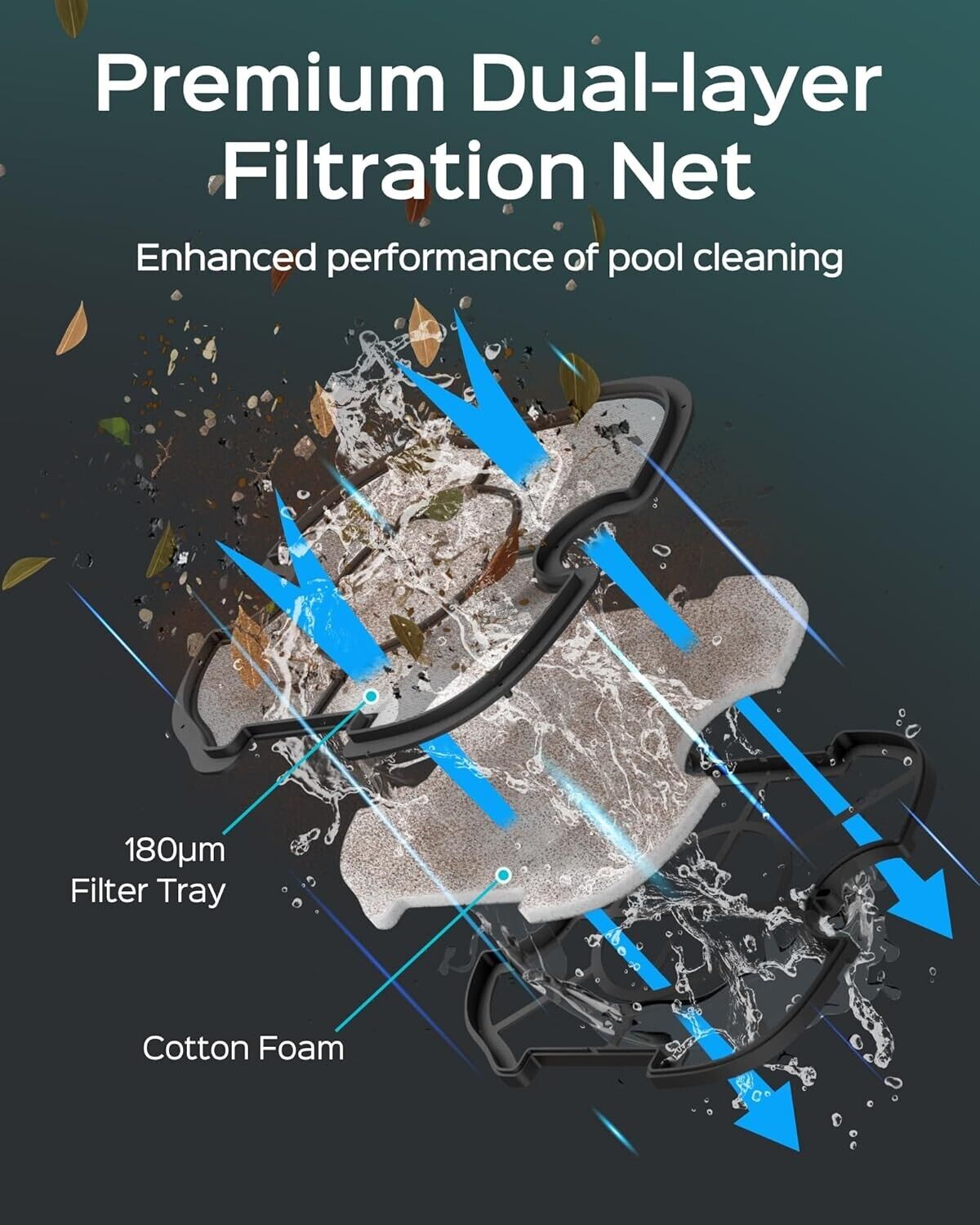 • Ein Doppelt Wirksames Filtersystem: Der Poolroboter A1 ist mit einem doppelschichtigen Filtersystem ausgestattet, das aus einer 180-μm-Filterscheibe und Baumwollschaum besteht. Dieses System fängt effektiv Partikel wie Sand, Blätter und andere Poolablagerungen ein, filtert gleichzeitig effektiv Staub und Feinpartikel, verhindert Lecks und sorgt für perfekt sauberes Poolwasser.