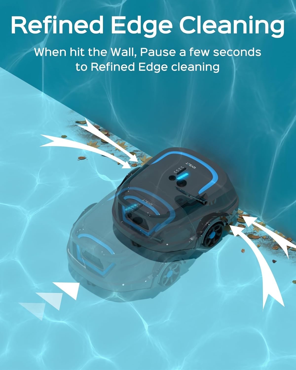 - Randreinigung (Exklusives WYBOT-Design): Anders als herkömmliche Geräte verstärkt der A1 poolsauger automatisch die Reinigung der Poolrandbereiche durch intelligente Sensoren, um sicherzustellen, dass keine Schmutzpartikel übersehen werden und eine umfassende Reinigung gewährleistet ist.