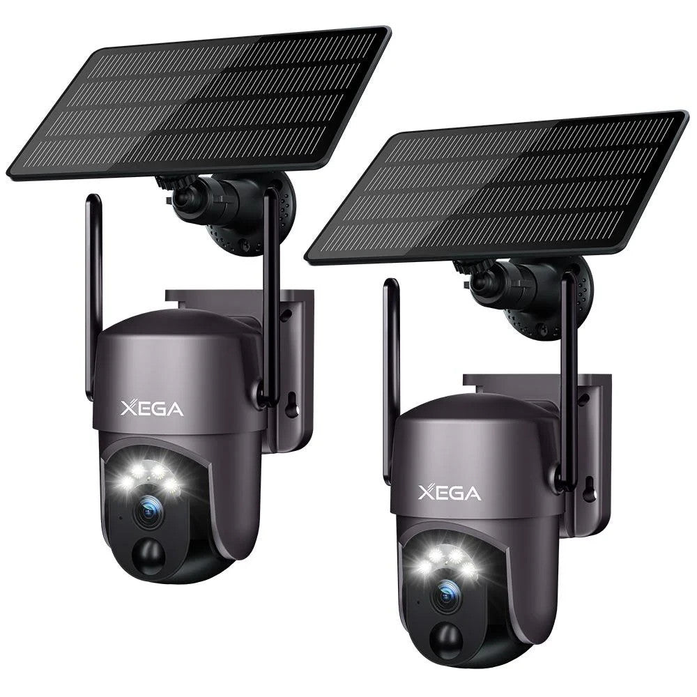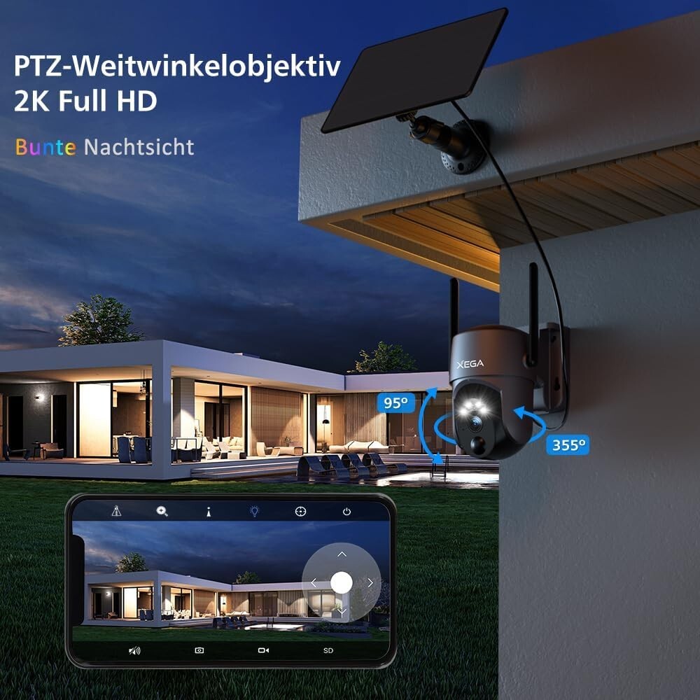 Xega Solare Überwachungskamera Aussen kabellos, 2K Super HD PTZ CCTV Kamera WLAN Überwachungskamera Heim Sicherheit Farbe Nachtsicht PIR Personenerkennung Zwei-Wege-Audio 2er Set