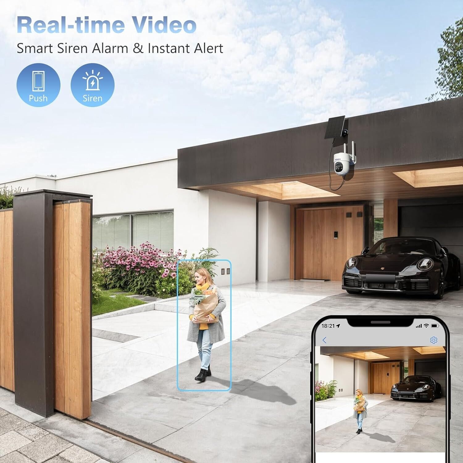 - PIR-Bewegungserkennung & Echtzeit-Alarm:Drei Alarmmodi: Sirenenalarm, Scheinwerfer-Alarm und APP-Benachrichtigungs-Push. Bei aktivierter Sirenen- und Scheinwerfer-Alarmfunktion erhalten Sie nicht nur eine Alarmbenachrichtigung per App, sondern die solar überwachungskamera aussen akku gibt auch einen Alarmton von sich und schaltet bei Dunkelheit den Scheinwerfer ein, was Eindringlinge effektiv abschrecken kann.