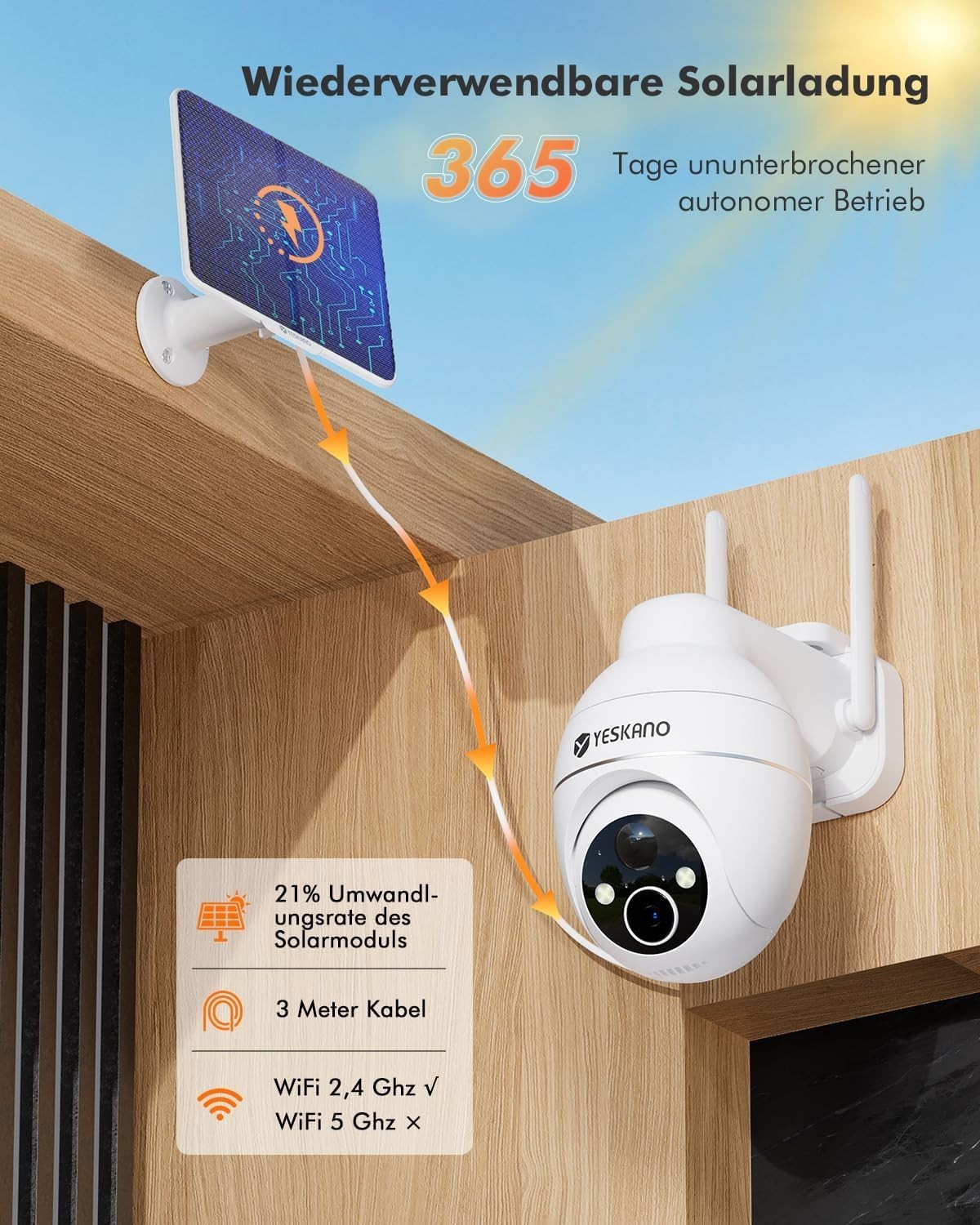 - [Solarbetrieben und 100 % kabellos] Die YESKANO Überwachungskamera Aussen verfügt über einen eingebauten Akku mit großer Kapazität, der mit Solarpanel arbeitet, um 365 Tage ununterbrochenen Schutz zu gewährleisten. Keine Kabel erforderlich, 100 % kabellos.
