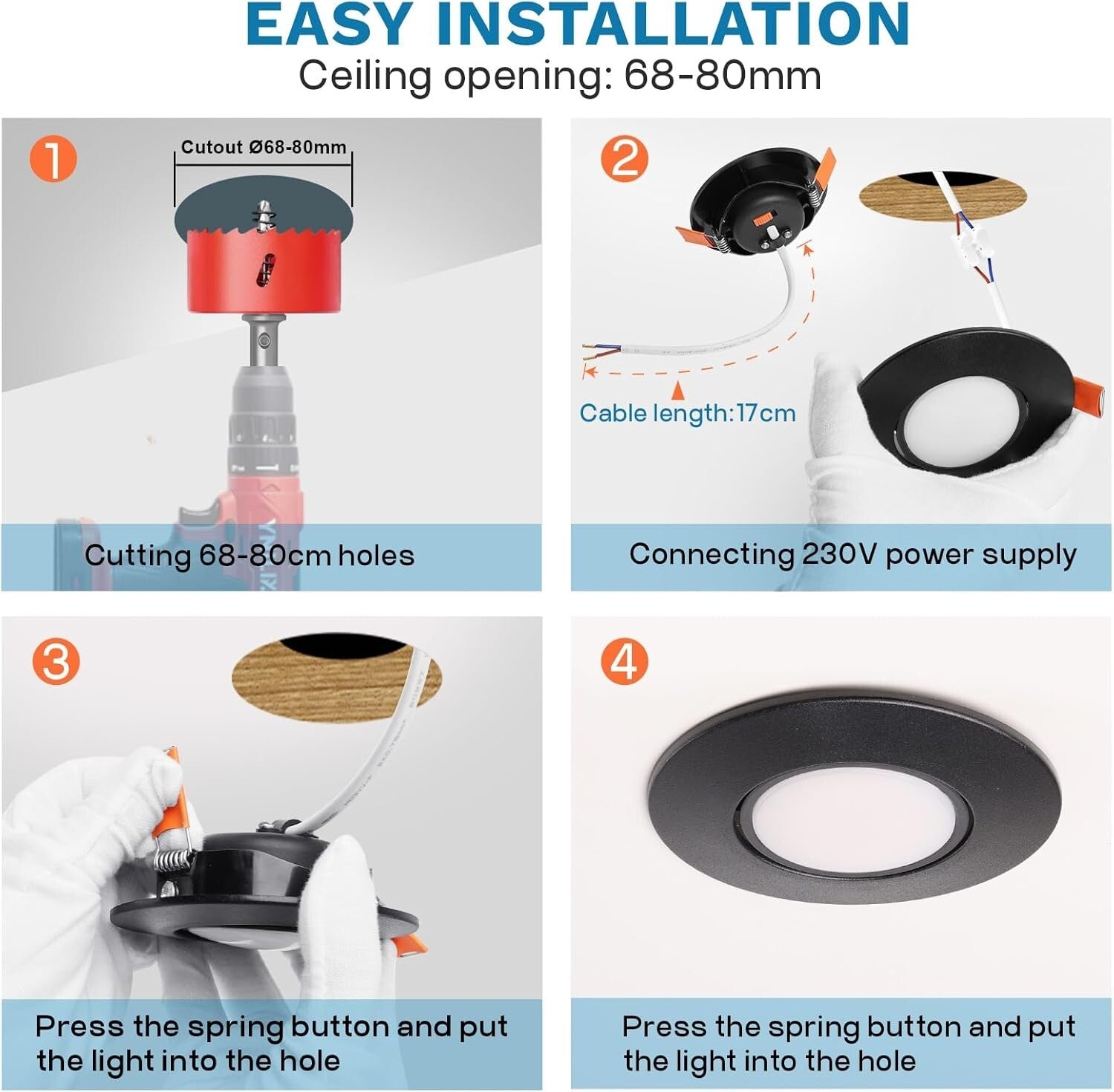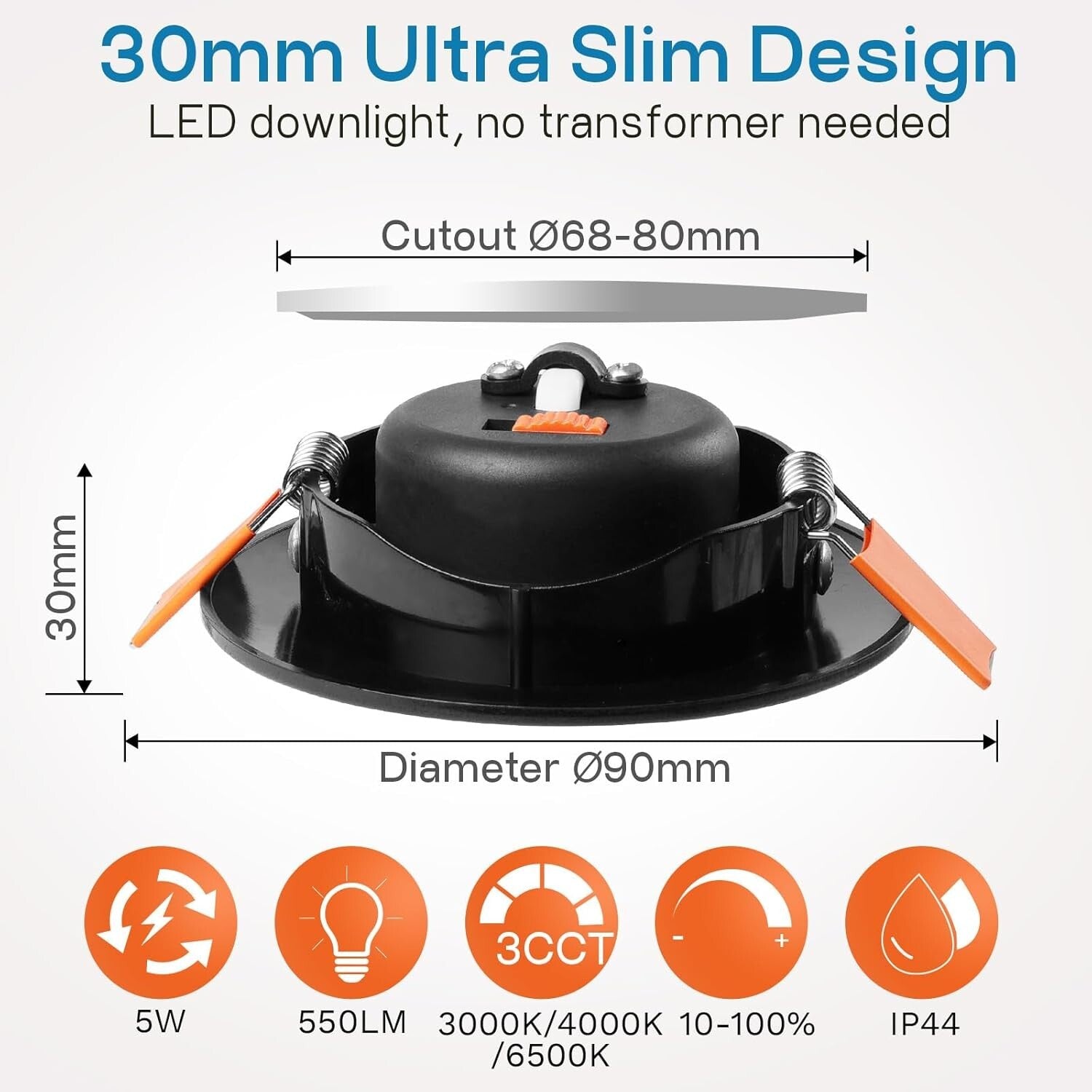 • 【Einfache Installation】Ultra Flach Deckenspots led mit einer Einbautiefe von nur 29 mm, ideal für Decken mit begrenzter Höhe. 90 mm Durchmesser, geeignet für Bohrungsdurchmesser 68–80 mm, Kabellänge bis zu 170 mm, direkter Anschluss an 230 V Stromversorgung, kein zusätzlicher Transformator oder Zubehör erforderlich.