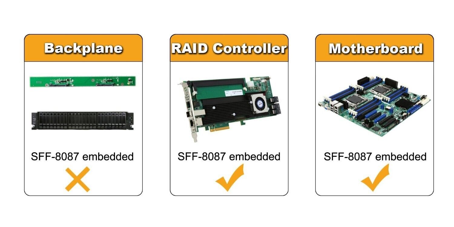 - Internes Mini SAS 36pin SFF8087 mit W/Riegel, 7pin SATA weiblich (x4), in 6 GB/s Bandbreite.