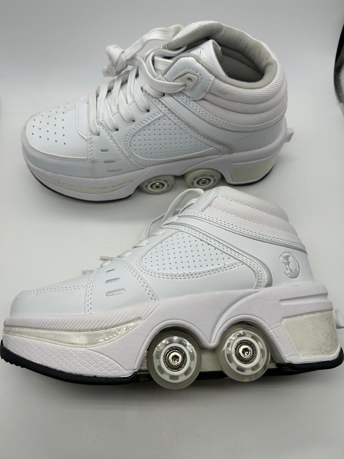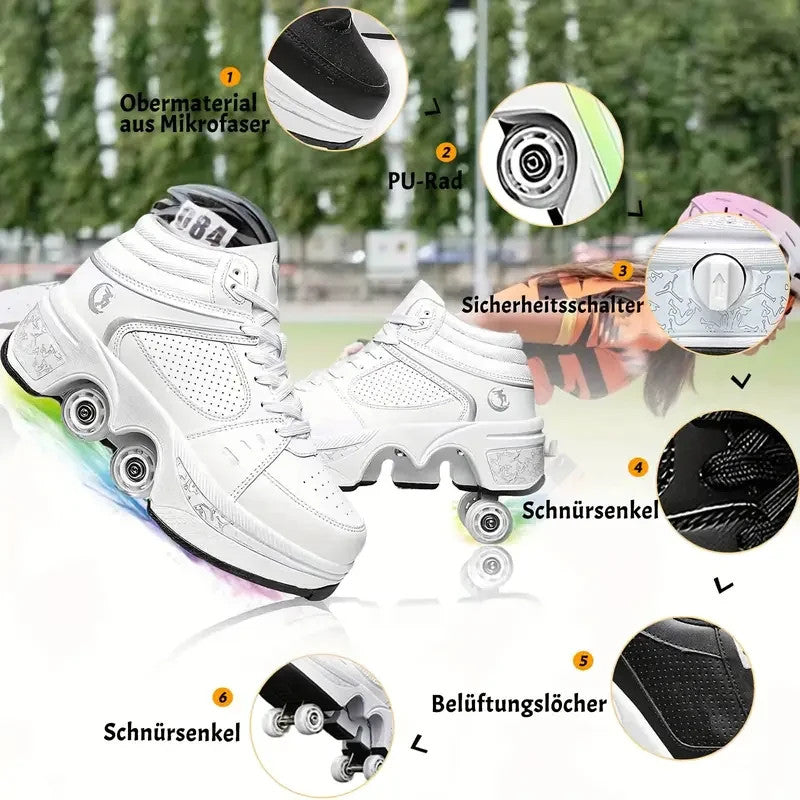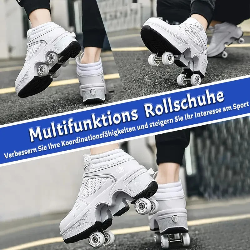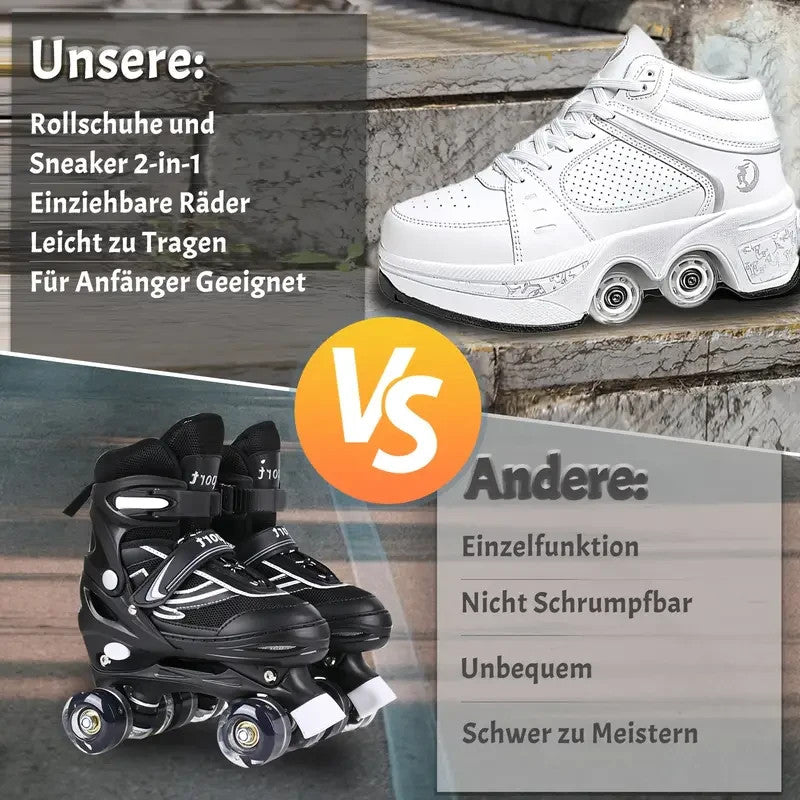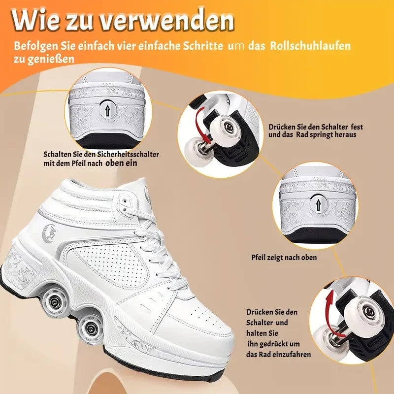 • 【2-in-1-Quad-Rollschuhe】: Schuhe mit rollen, Die kreative Sohle hat ein Paar versteckter Räder. Wenn Sie gleiten möchten, drehen Sie einfach den Fersenschalter und schalten Sie das Lenkrad ein, um sich leicht von Parkour-Schuhen zu wechseln, um Skates umwandeln. Das gleitende Team Ihres Freundes wartet auf Sie!.