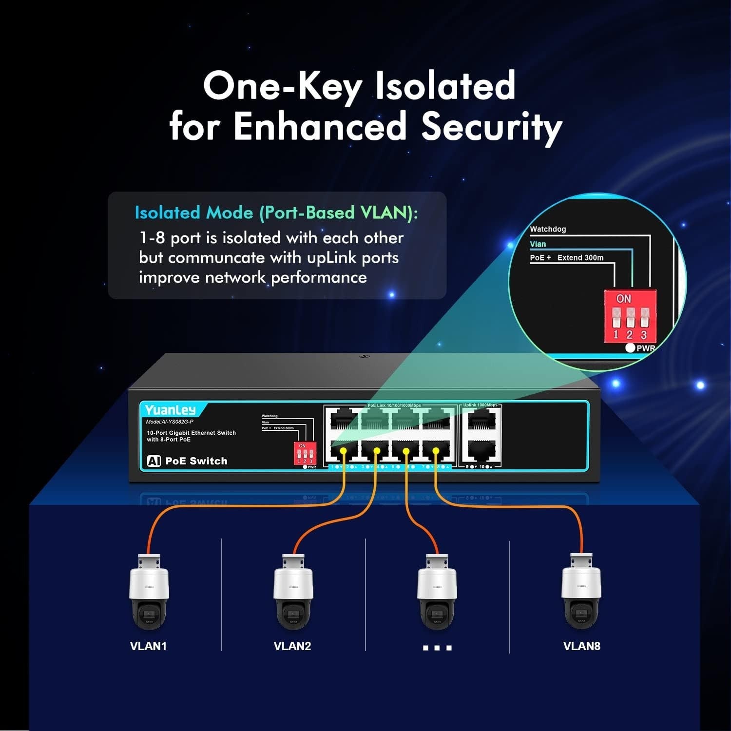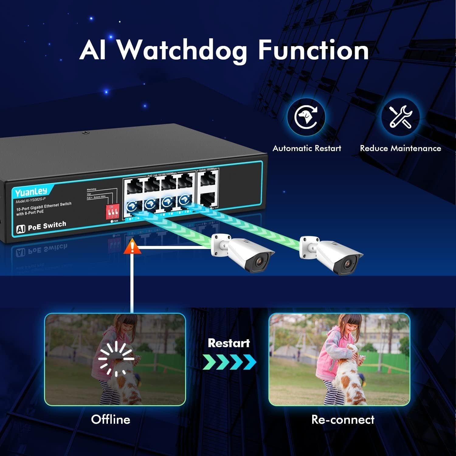 • 【VLAN-Isolierung, AI-WatchDog】PoE-Ports 1-8 unterstützen VLAN-Isolierung, der Datenverkehr ist voneinander isoliert; Unterstützung Watchdog AI intelligente Erkennung. Wenn das POE-Gerät ausfällt oder abstürzt und offline geht, wird es automatisch das Gerät neu starten, um die Verbindung wiederherzustellen, machen Betrieb und Wartung einfacher.