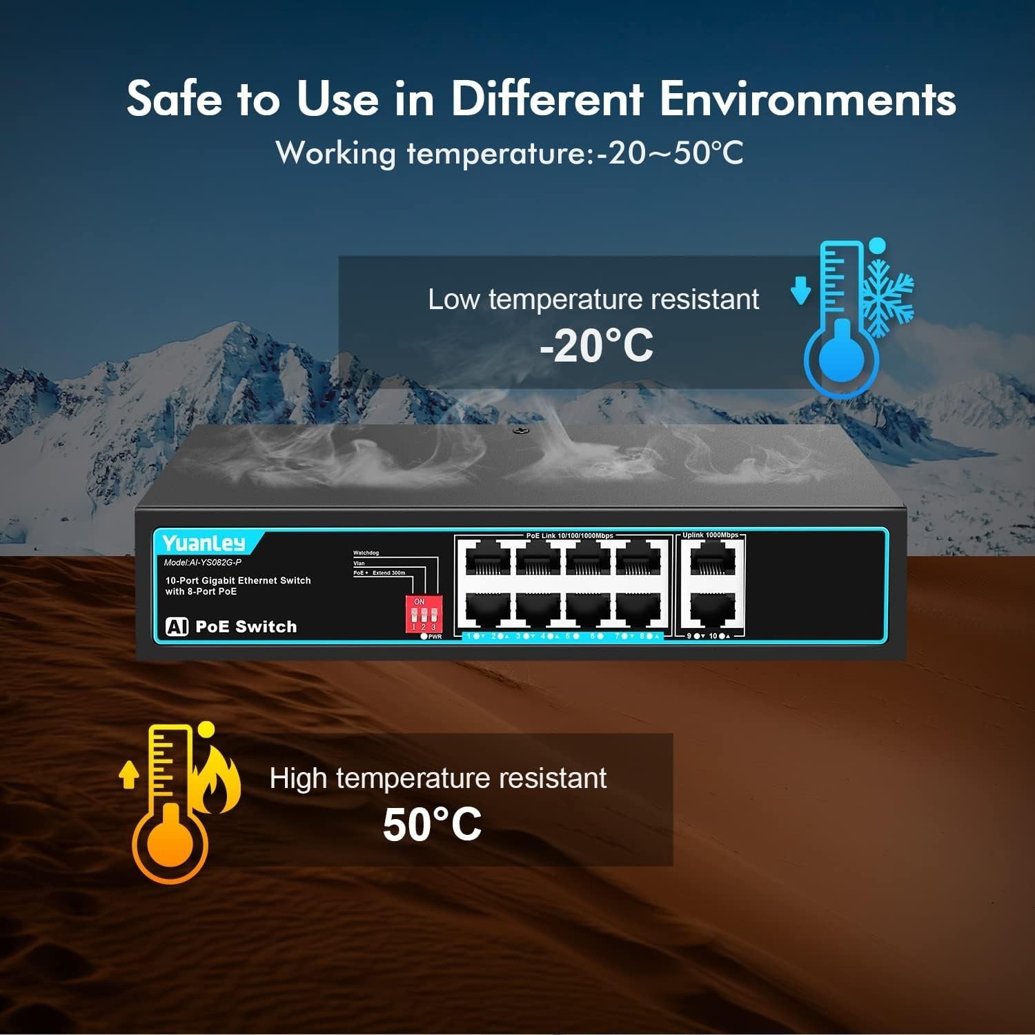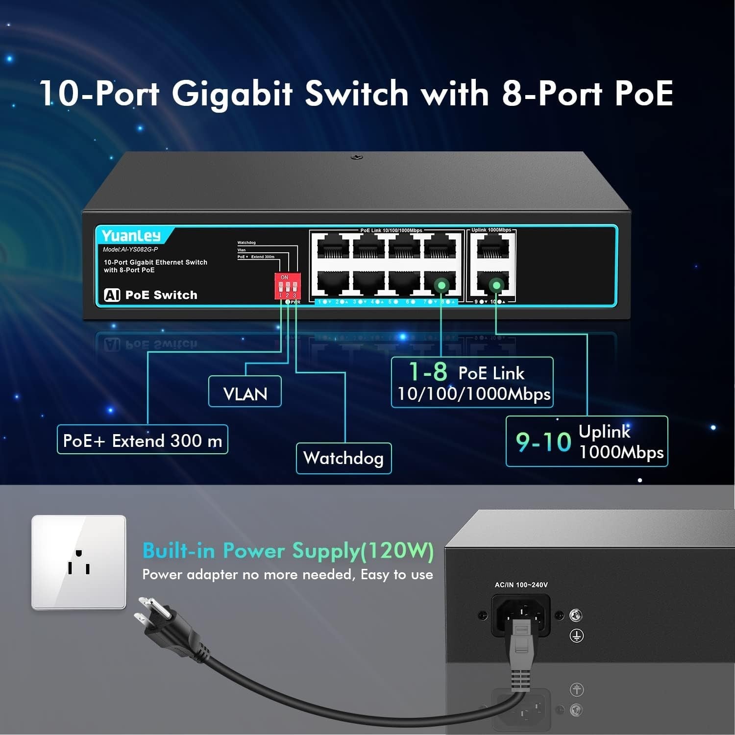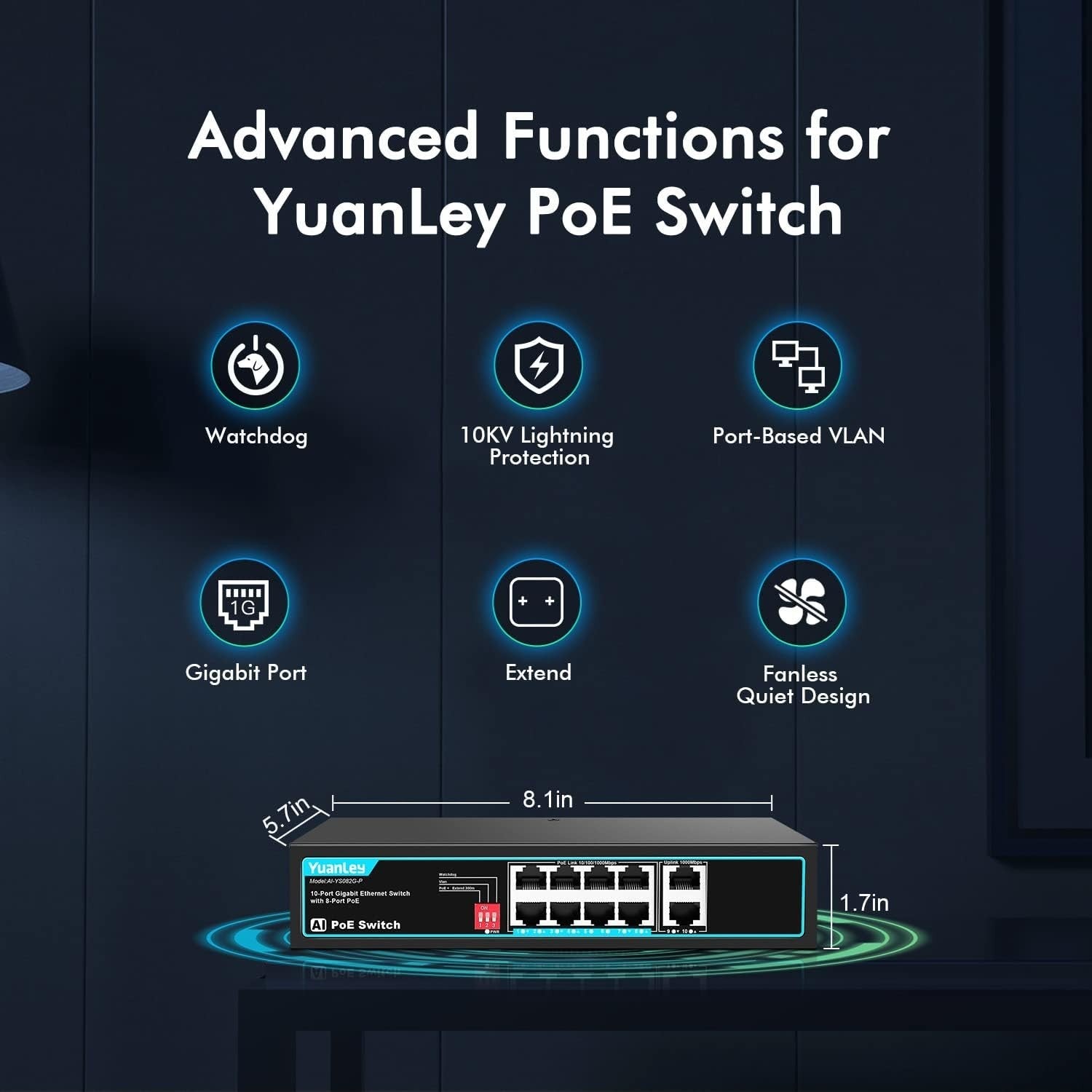 YuanLey 8-Port-Gigabit-PoE-Switch, 8 PoE+-Ports 1000 Mbit/s, 2 Gigabit-Uplink, 8