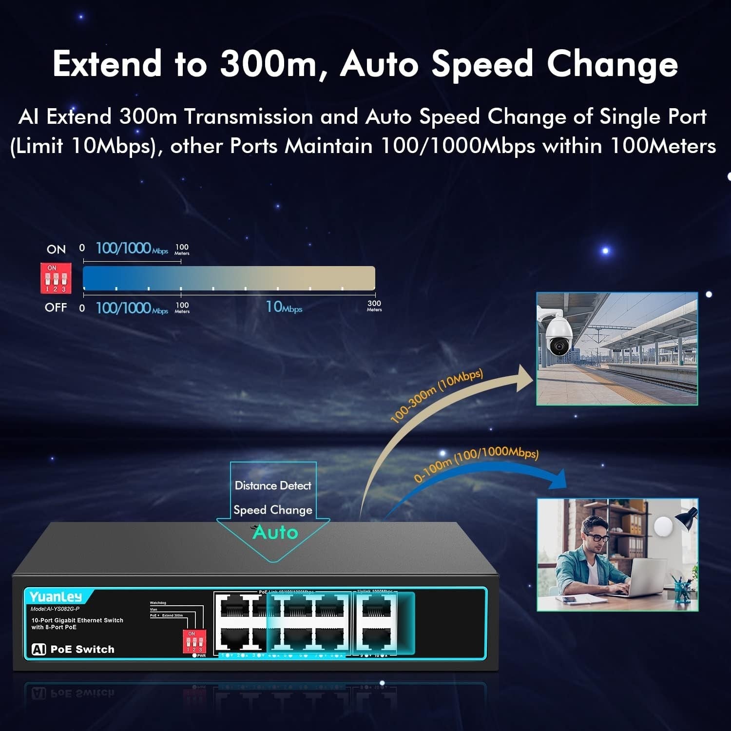 • 【AI-Erweiterung, Plug and Play】Unterstützung AI erweitern 300 Meter Übertragung und automatische Geschwindigkeitsänderung von einzelnen Ports (Grenze 10Mbps), andere Ports halten 100M/1000M innerhalb von 100 Metern. Plug and Play, schließen Sie einfach das Netzkabel und das Netzwerkkabel an, keine Konfiguration erforderlich, einfach zu bedienen.